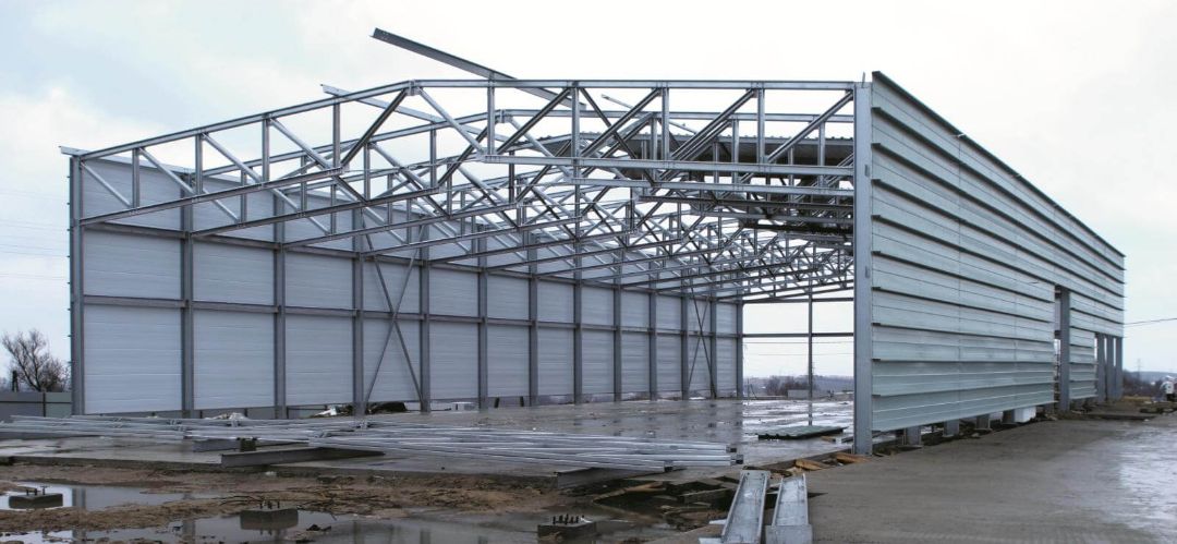Каркасные – этот метод так же быстр и удобен. Если хранилище маленькое, используются металлические профили меньшего сечения, а для больших пром-объектов перекрытия из металла. Детали изготавливаются серийно и собираются уже по месту. При этом стены выполняются из мерных сэндвич-панелей. Под малые стальные устроения устанавливаются столбчатые или свайные основания. К ним закрепляются колонны, а потом горизонтальные, вертикальные и кровельные прогоны. К каркасу прикрепляются стеновые сэндвич-панели, крыша строится так же из них или из рулонных материалов с тщательной герметизацией стыков. Это даёт дополнительную жесткость и улучшает внешний вид сооружения.